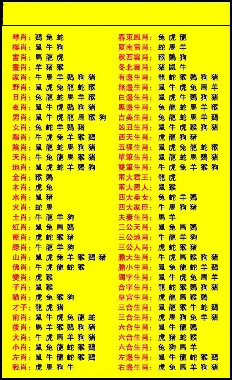 | 琴:鸡兔蛇/棋:鼠牛狗/书:马龙虎/画:羊猴猪 |